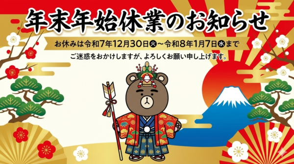 2025年12月30日㈫~ 2026年1月7日㈬まで、通常の不動産売買業務はお休み頂きます。
